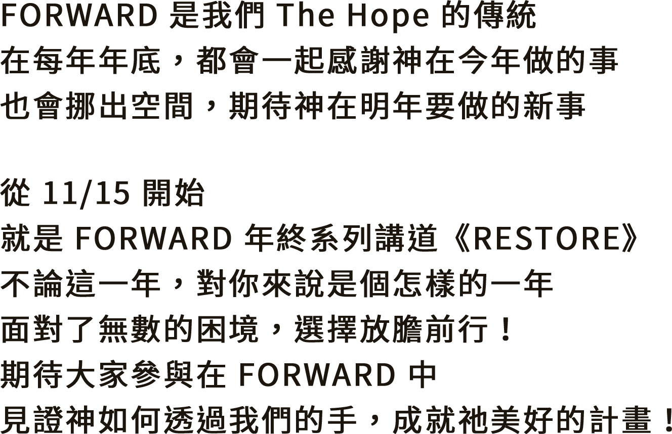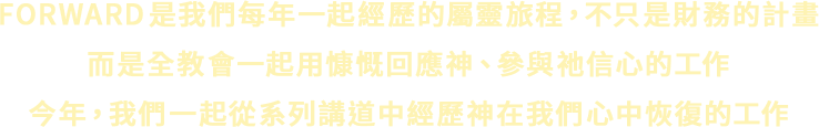 參與FORWARD奉獻 為什麼我們要開始FORWARD外展建堂奉獻? FORWARD外展建堂奉獻將會是在十一以外的一筆奉獻,運用在五大事工上 參與FORWARD奉獻 在這六年中,神是如此恩待 The Hope!從一個城市,擴展到多個城市從一個敬拜聚會,到無數生命被翻轉的見證 位做決志 位受洗 位VIP新朋友 位 THC 畢業生 位夥伴參與服事 個國家被觸及與服事